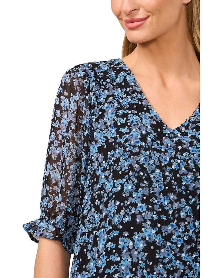- Versatile and chic, the CeCeâ„¢ Elbow Sleeve Ruff V-Neck Blouse pairs effortlessly with everything from tailored pants to your favorite denim, making it a go-to choice for both casual and dressy occasions. It has a V-neckline and elbow-length sleeves with smocked cuffs.