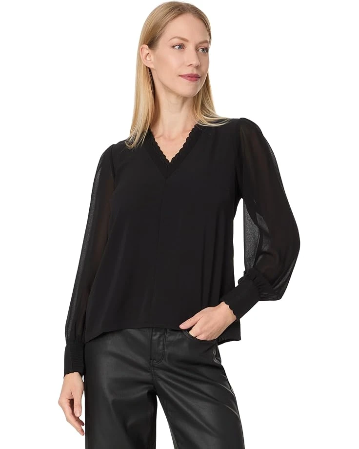 - Make a statement wearing the CeCe™ Long Sleeve V-Neck Top W/ Combo Sleeve & Neckline with a feminine neckline and scallop design. This versatile piece effortlessly blends modern style with classic sophistication, ensuring you stand out wherever you go. This classic fit top features soft and gauzy texture.