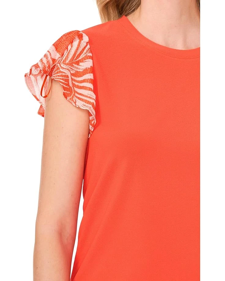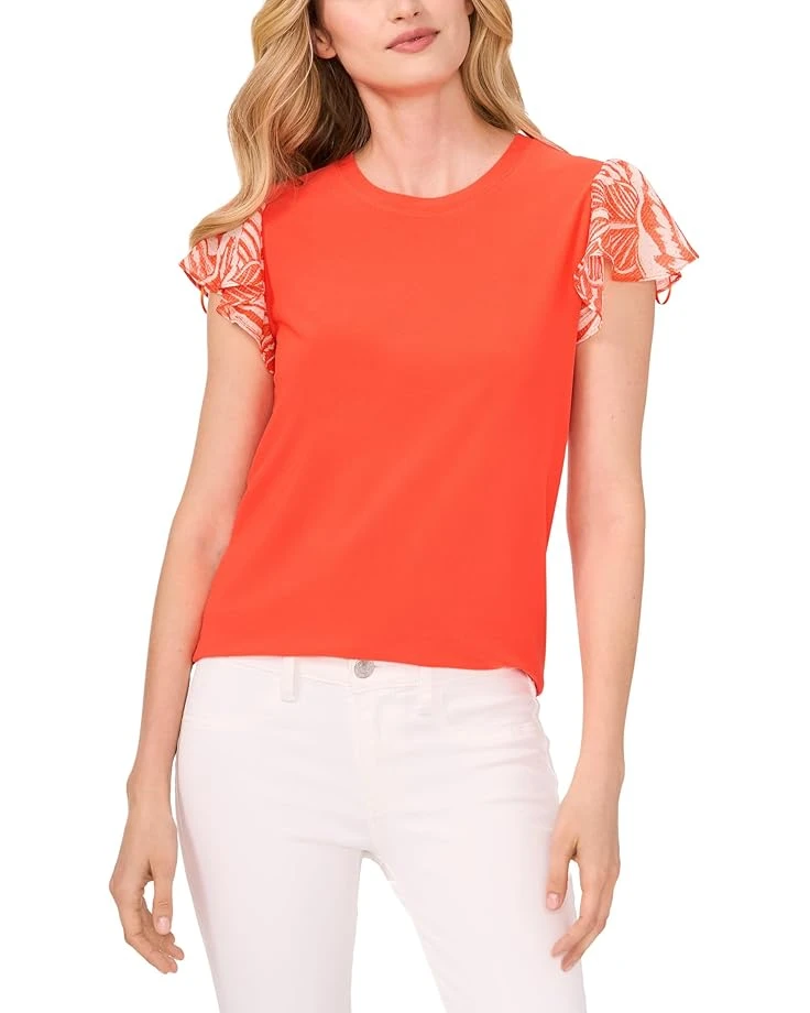 - The CeCe™ Mix Media Flutter Sleeve Knit Top is a stylish and versatile wardrobe essential that offers an effortless flair with its flattering silhouette and feminine detailing. The short printed Yoryu sleeves, round neckline, and straight hem add to its style. This chic top is crafted from crepe knit fabric that offers superior comfort and breathability. Style up your everyday looks and styles wearing this short-sleeve top.