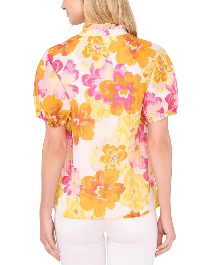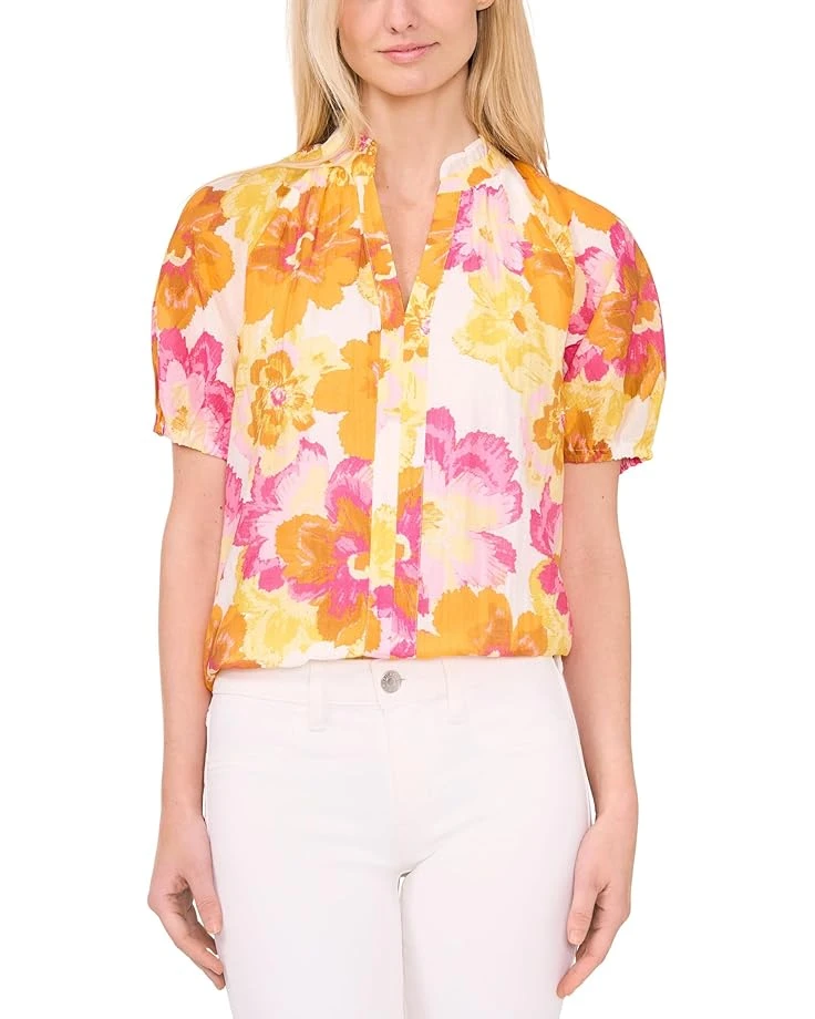 - Feel confident, feel flirty styling CeCe™ Printed Ruffle Neck Raglan Seam Split Neck! Elevate your style with a ruffled split neckline and printed slub organdy fabric that exudes sophistication. Experience the perfect blend of fashion and functionality with raglan seam construction and short puffed elasticized sleeves for a touch of flair.