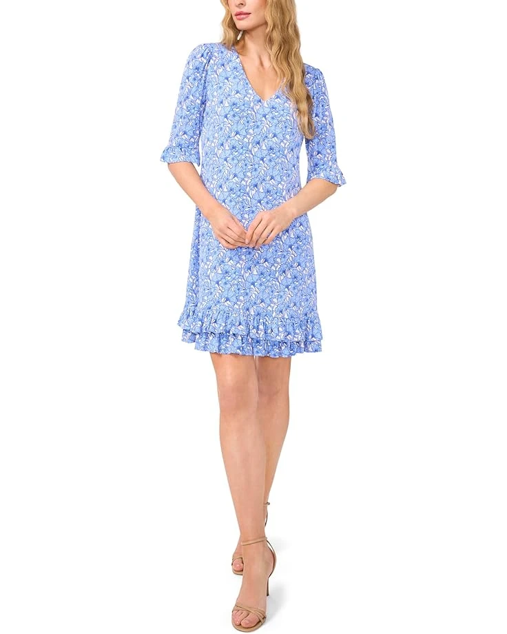 - The CeCe™ V-Neck Knit Dress With Ruffle Hem offers the perfect blend of comfort and style. Crafted from a soft, breathable knit fabric, this printed dress features a flattering V-neckline that beautifully frames the face and adds a touch of elegance. It is designed with elbow-length sleeves and a ruffled hem. Designed in an A-line silhouette with an allover floral print, this short dress works for different occasions.