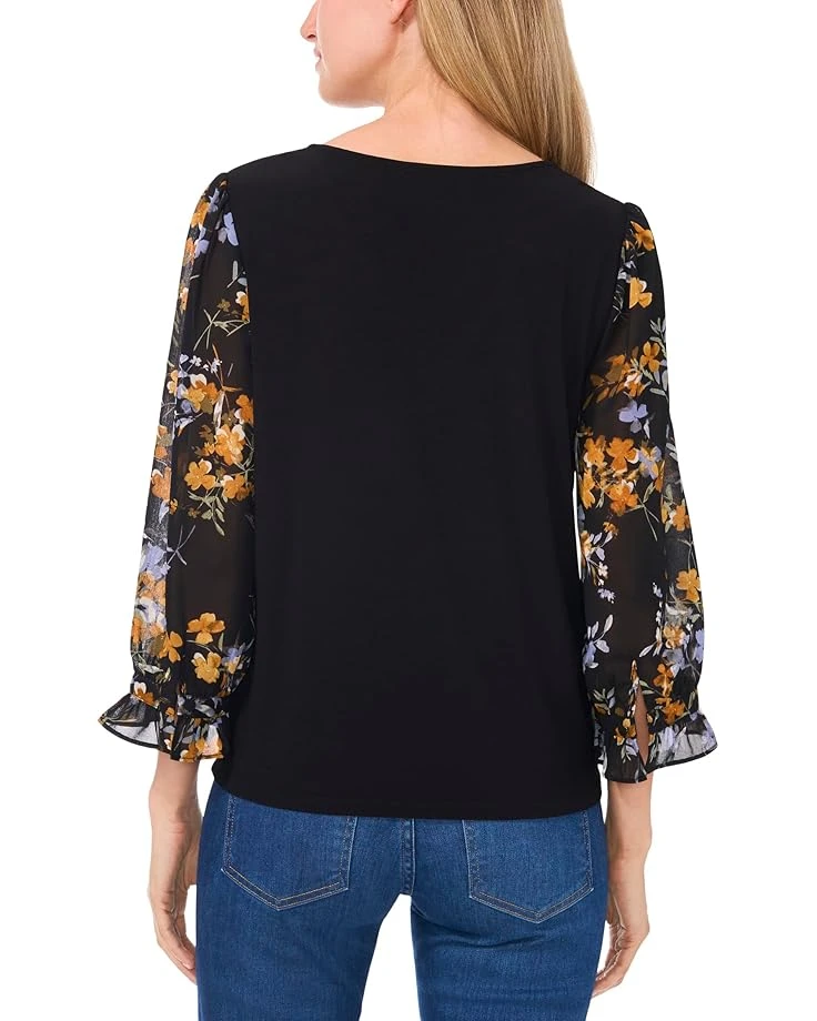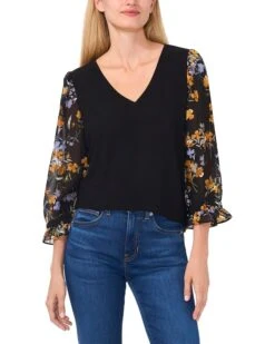 - Effortlessly chic and trend-forward, the CeCeâ„¢ V Neck Mix Media 3/4 Sleeve Top boasts floral mixed media sleeves, blending crepe knit and gauzy textures for a look that’s both feminine and edgy. The V-neck and quarter sleeves create a flattering frame for your neckline, while the classic fit and pull-on design ensure comfort and style in every move.