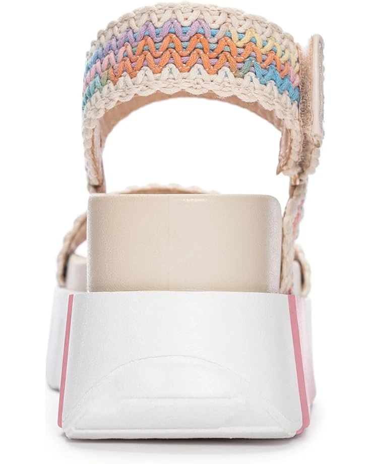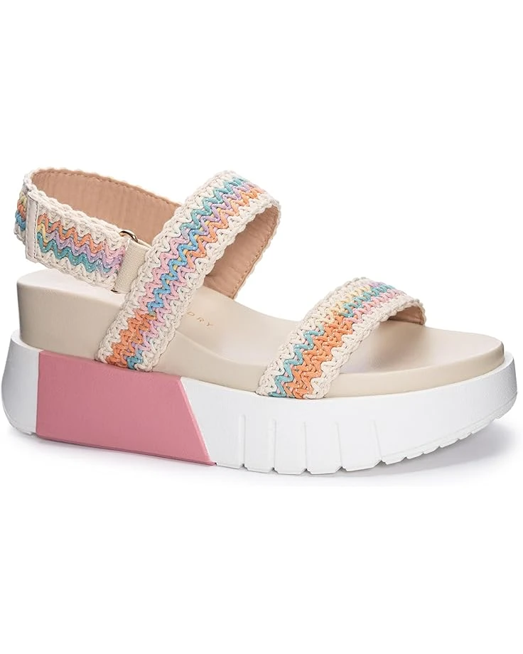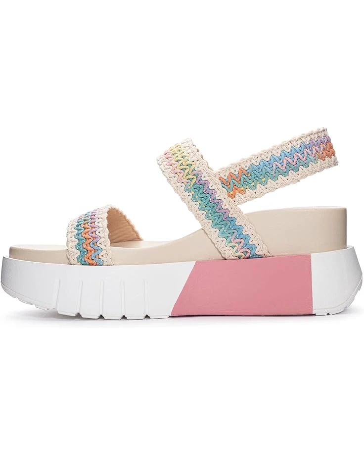 - Topped with multicolored crocheted woven upper straps and integrated with a contoured cushioned EVA insole, the Chinese Laundry® Egan equally parts fashion and comfort. These chic and sporty wedge sandals are framed in an open round toe silhouette and come equipped with an adjustable hook-and-loop closure on the slingback strap for a custom fit.